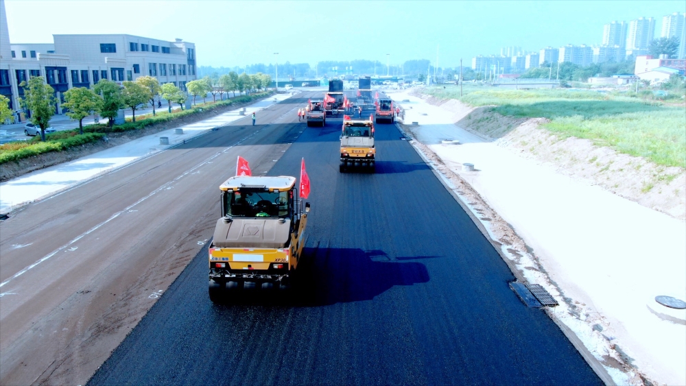 5月3日,在霍邱縣蓼東大道施工現(xiàn)場(chǎng),工人們正進(jìn)行安陽山路至五岳路段下面層瀝青攤鋪工作,一輛輛運(yùn)料車、攤鋪機(jī)、壓路機(jī)來回穿梭。