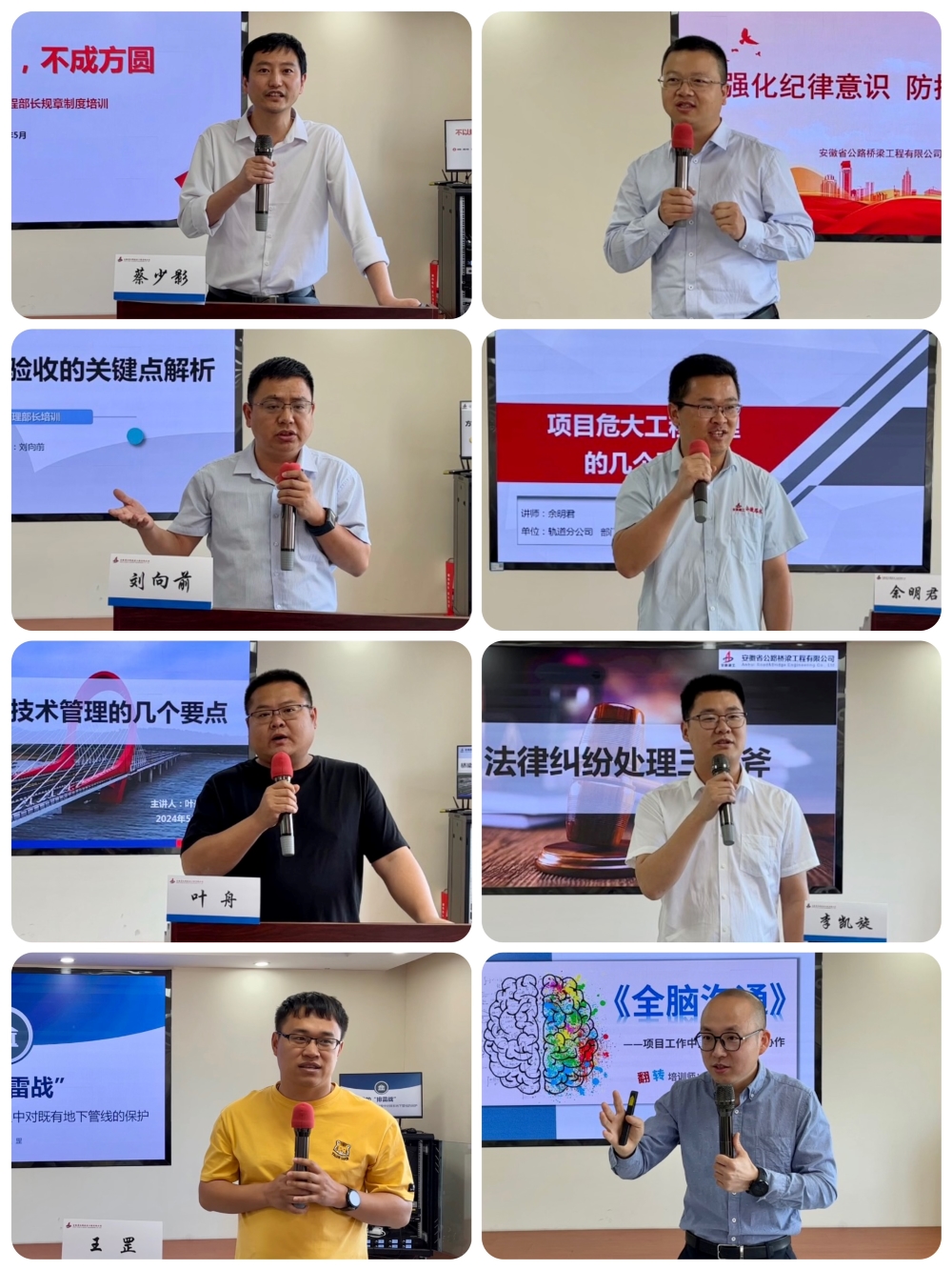 培訓(xùn)采用新老講師結(jié)合的形式,內(nèi)容涉及公司最新規(guī)章制度解析、方案編制和檢查驗收、橋梁工程施工技術(shù)、地下管線保護、項目危大工程、廉潔教育、法律糾紛處理以及通用管理課程等。