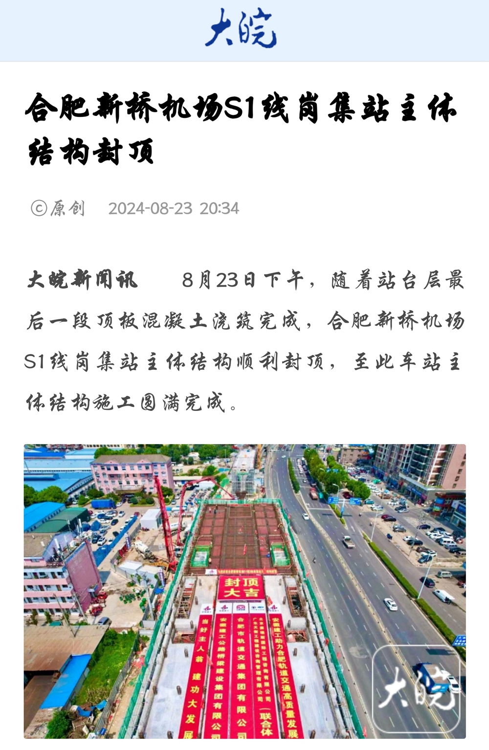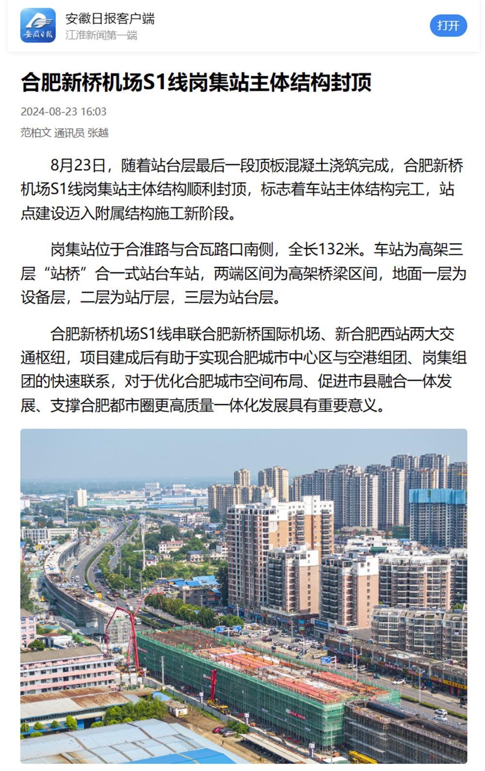 【名媒聚焦】央廣網(wǎng)、中安在線、安徽日報等主流媒體聚焦合肥新橋機場S1線項目崗集站主體結(jié)構(gòu)封頂