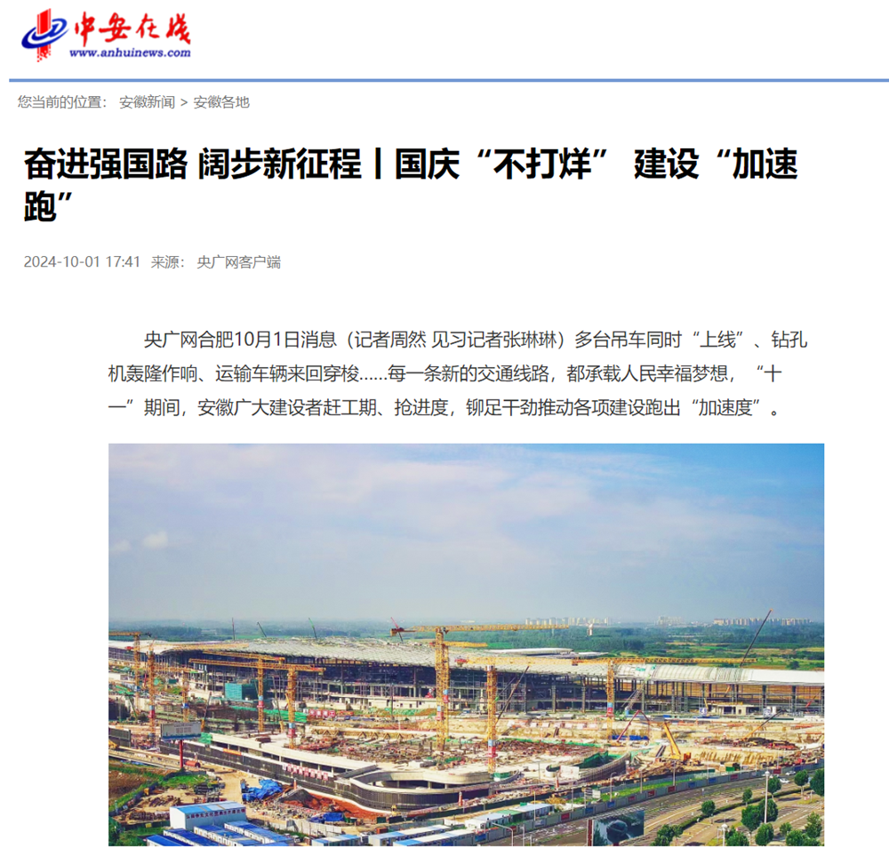 國慶假期,公司所屬各重點(diǎn)項(xiàng)目“不打烊”,推動項(xiàng)目建設(shè)“加速跑”,受到中央廣播電視總臺、新華社、央廣網(wǎng)、安徽衛(wèi)視、中安在線等國家和省部級主流媒體聚焦報道。