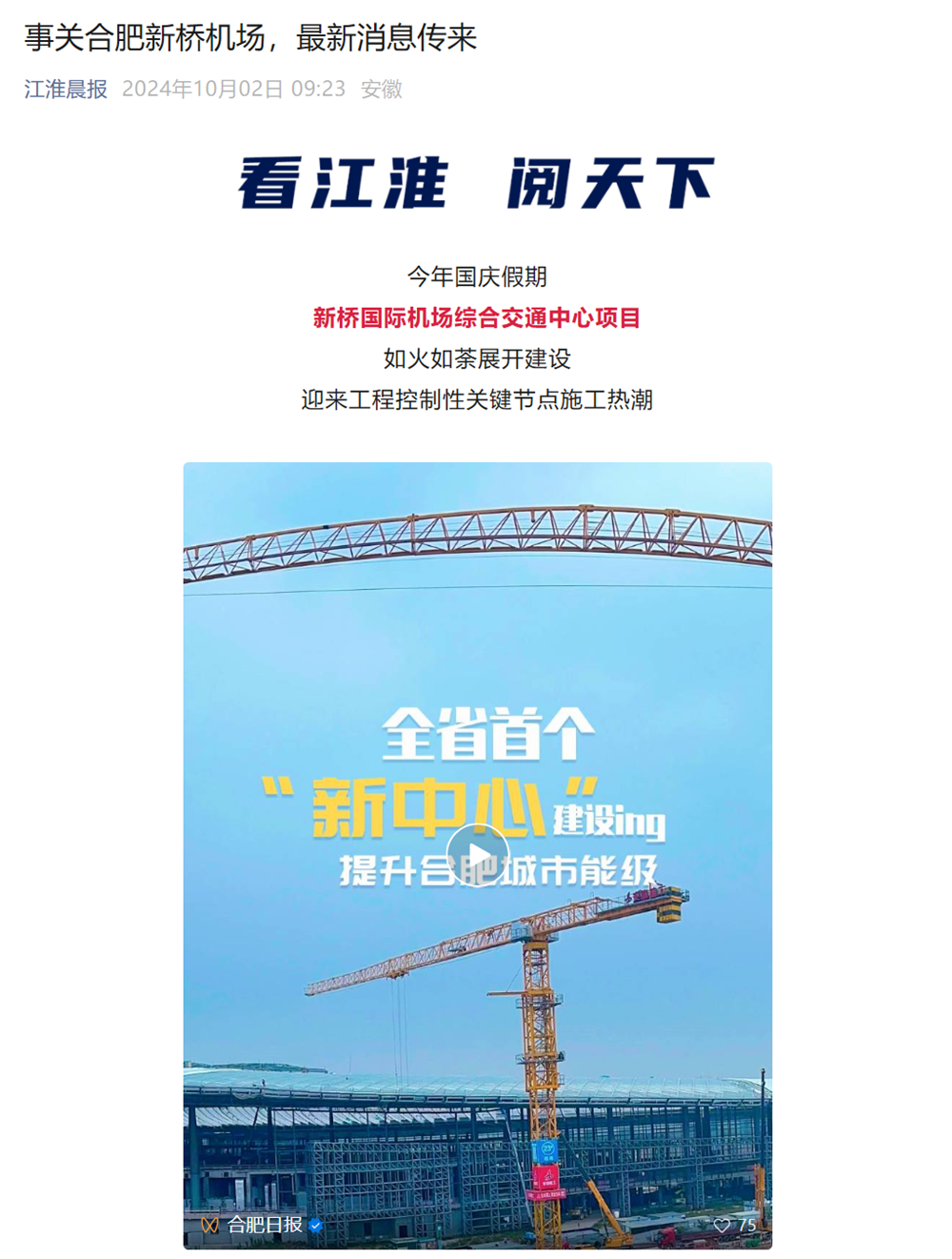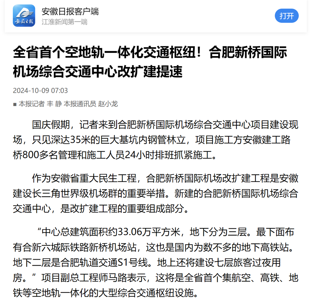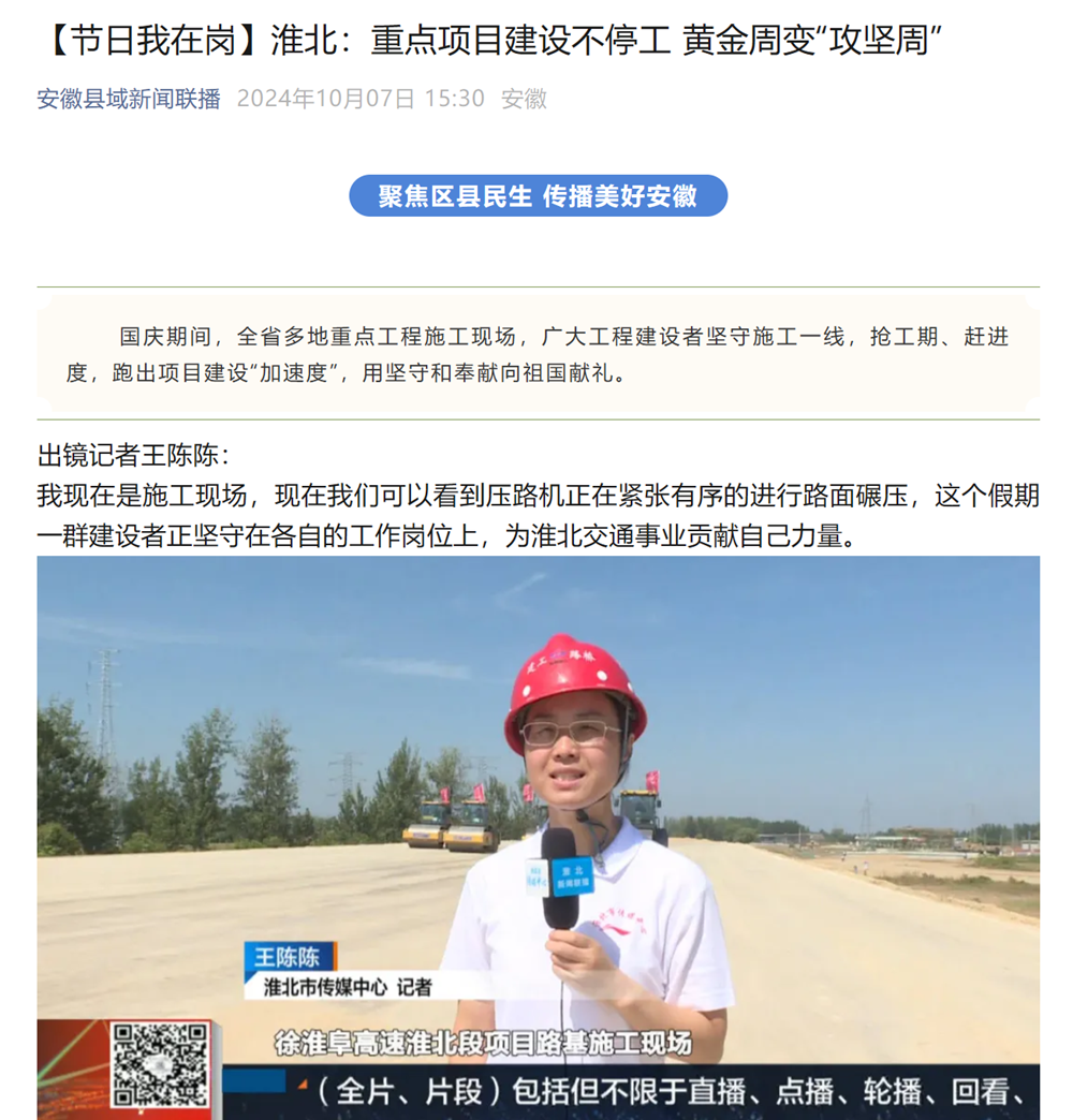 國慶前后,安徽新聞聯(lián)播、安徽日報、江淮晨報等多家省級主流媒體紛紛聚焦公司承建的涇青高速04標(biāo)、徐淮阜高速淮北段、合肥新橋國際機場綜合交通中心等重點項目建設(shè)情況進行報道。