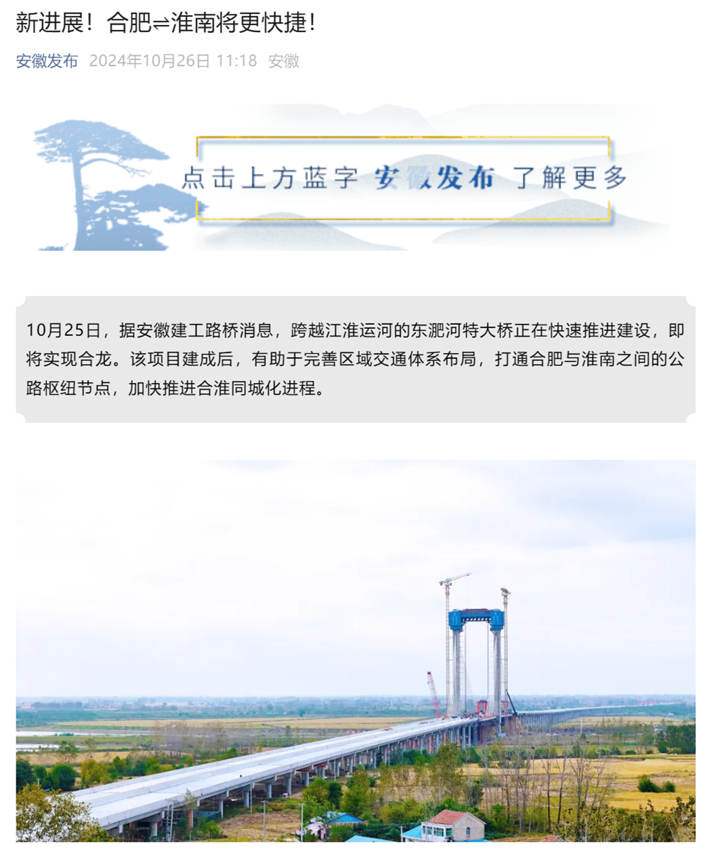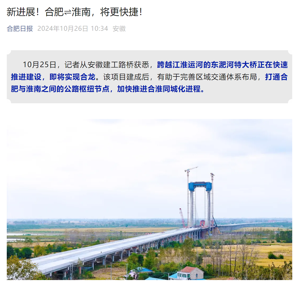 【名媒聚焦】安徽發(fā)布、合肥日?qǐng)?bào)、淮河早報(bào)等主流媒體持續(xù)聚焦東淝河特大橋建設(shè)