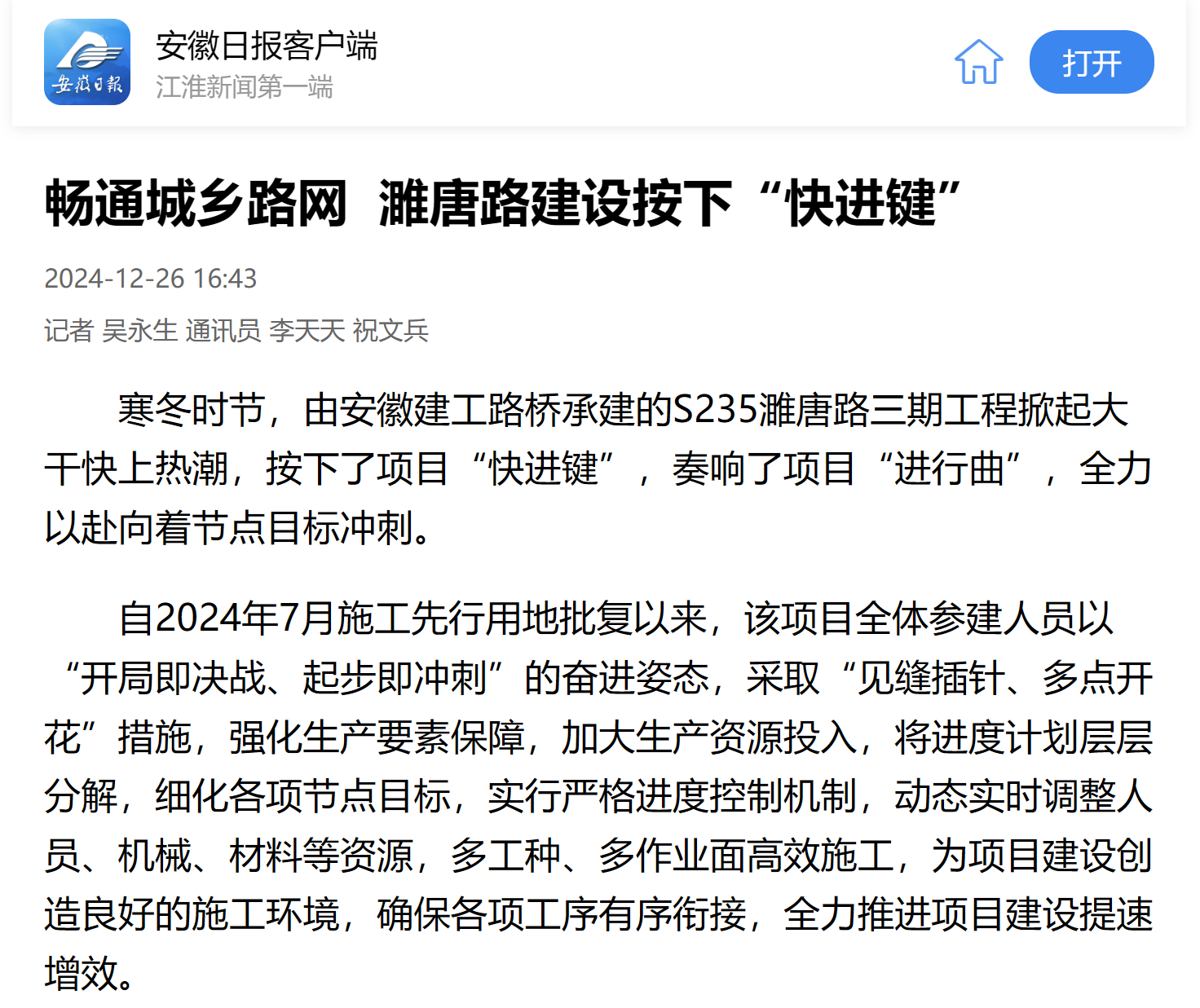 【名媒聚焦】安徽日報客戶端:暢通城鄉(xiāng)路網(wǎng) S235濉唐路三期項目建設(shè)按下“快進(jìn)鍵”