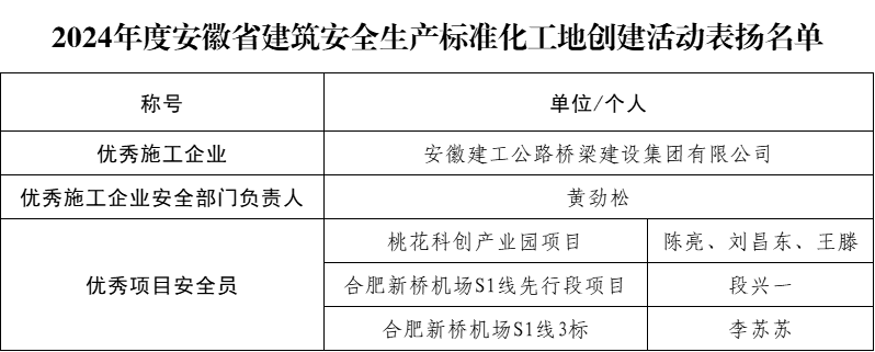 近日,安徽省建設(shè)工程與質(zhì)量安全協(xié)會發(fā)布表揚通知,公司榮獲“2024年度安徽省建筑安全生產(chǎn)標(biāo)準(zhǔn)化工地優(yōu)秀施工企業(yè)”稱號,公司安全環(huán)保部黃勁松同志榮獲“2024年度安徽省建筑安全生產(chǎn)標(biāo)準(zhǔn)化工地優(yōu)秀施工企業(yè)安全部門負(fù)責(zé)人”稱號,桃花科創(chuàng)產(chǎn)業(yè)園項目、合肥新橋機(jī)場S1線先行段項目、S1線3標(biāo)等3個項目安全管理人員榮獲“優(yōu)秀項目安全員”稱號。
