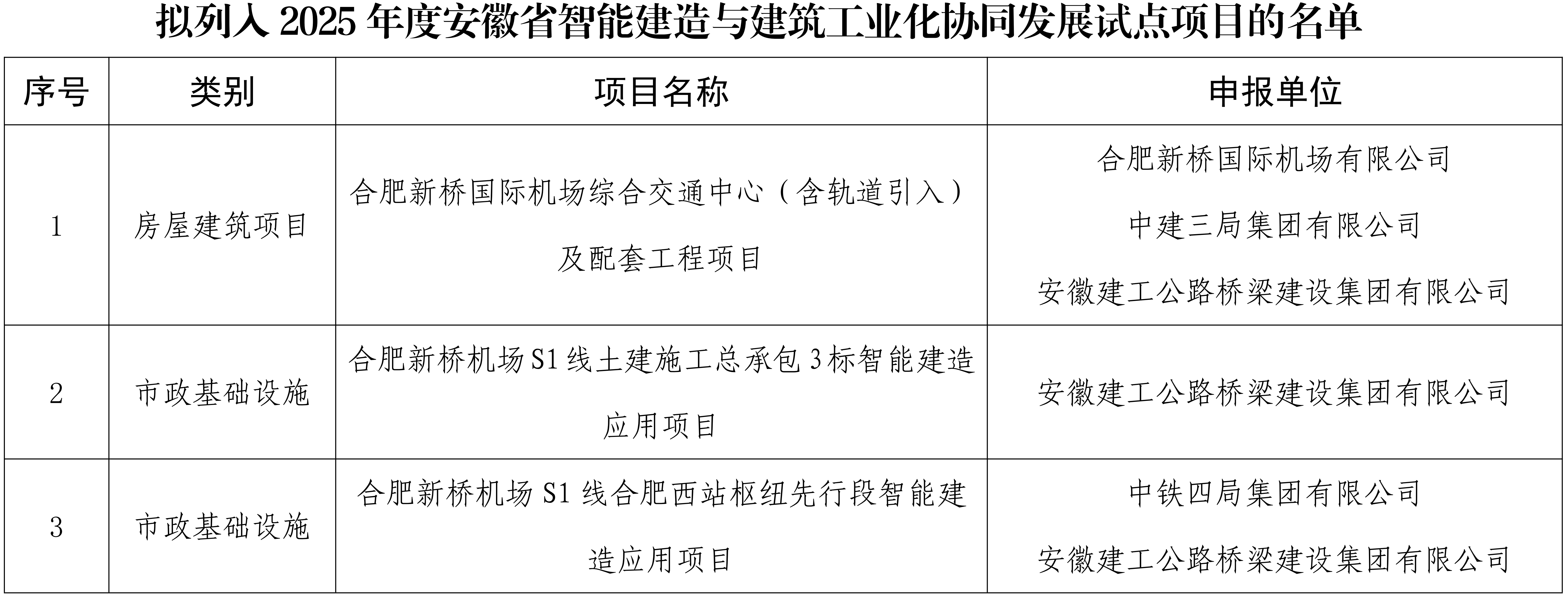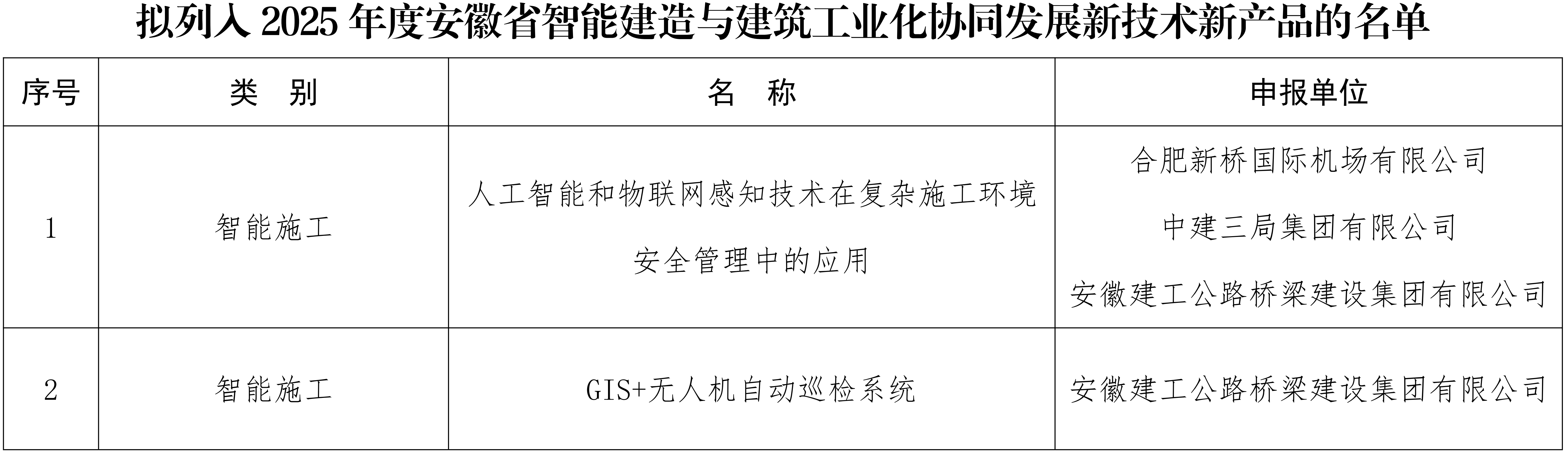 近日,安徽省住房和城鄉(xiāng)建設(shè)廳公布了2025年度安徽省智能建造與建筑工業(yè)化協(xié)同發(fā)展新技術(shù)新產(chǎn)品及試點(diǎn)項目,公司“新橋機(jī)場S1線土建施工總承包3標(biāo)”、“新橋機(jī)場S1線合肥西站樞紐先行段”、“合肥新橋國際機(jī)場綜合交通中心(含軌道引入)及配套工程”三個項目,“人工智能和物聯(lián)網(wǎng)感知技術(shù)在復(fù)雜施工環(huán)境安全管理中的應(yīng)用”、“GIS+無人機(jī)自動巡檢系統(tǒng)”等兩項產(chǎn)品應(yīng)用成功入選。
