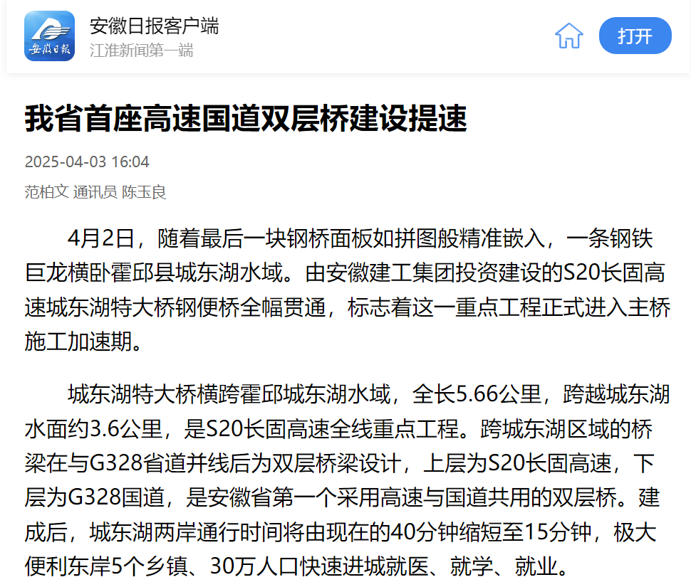 安徽建工S20長固高速路基01標(biāo)工區(qū)負(fù)責(zé)人經(jīng)云介紹,城東湖特大橋橫跨城東湖水域,全程5.66km,是安徽省首個(gè)采用高速與國道共用雙層橋跨越湖泊項(xiàng)目,其中上層為S20長固高速,下層為G328國道。