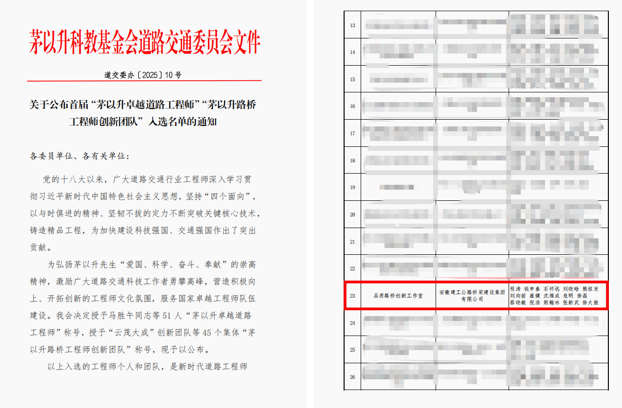 近日,茅以升科技教育基金會道路交通委員會公布首屆“茅以升路橋工程師創(chuàng)新團隊”評選結果,公司“品質(zhì)路橋創(chuàng)新工作室”憑借扎實的技術攻關能力與突出的工程實踐成果成功入選。