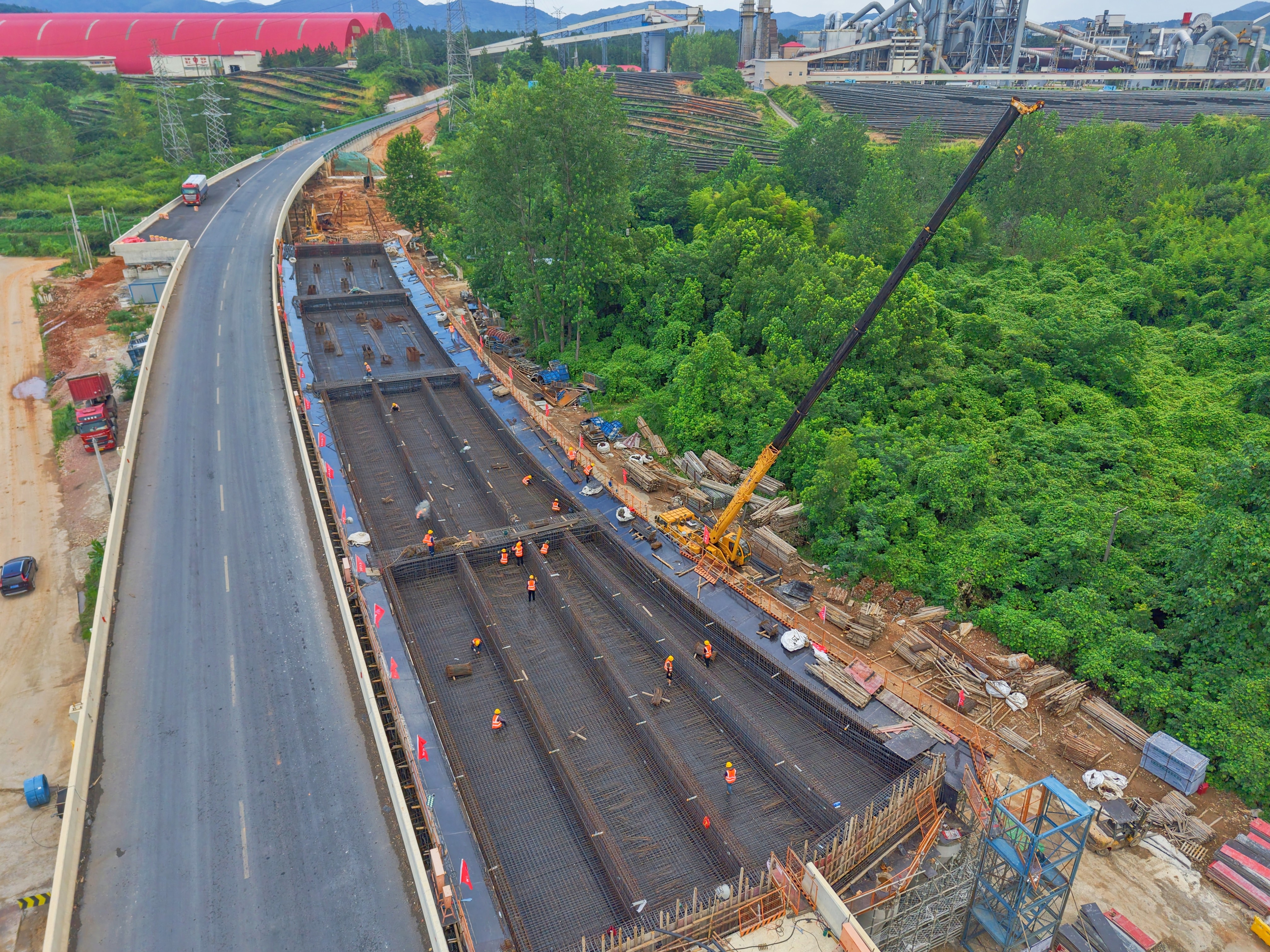 面對“邊施工、邊通車”的特殊施工環(huán)境,項(xiàng)目團(tuán)隊(duì)堅(jiān)持“既要保進(jìn)度,更要保暢通”的原則,采取半幅交替施工模式,將施工區(qū)域劃分為若干個作業(yè)斷面,同步推進(jìn)橋梁現(xiàn)澆、瀝青面層攤鋪等關(guān)鍵工序。王超介紹,目前全線路基工程已完成95%,全線預(yù)制梁板橋施工也已全部完成。作為控制性工程,水東四號橋施工進(jìn)展順利,目前已完成約85%的工程量,正在進(jìn)行右幅第五聯(lián)鋼筋綁扎及第六聯(lián)樁基施工作業(yè)。