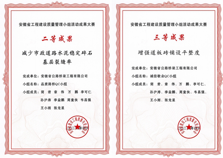 創(chuàng)新課題“積微成著”。憑借不同環(huán)境下的路基路面施工實(shí)踐,項(xiàng)目團(tuán)隊(duì)持續(xù)開展技術(shù)攻堅(jiān)和經(jīng)驗(yàn)萃取。在路面基層施工階段,通過嚴(yán)格控制石粉含泥量,成功避免水穩(wěn)碎石基層裂縫,基層壓實(shí)度全面控制在96%以上;在附屬結(jié)構(gòu)施工中,項(xiàng)目團(tuán)隊(duì)對人行道板磚使用及鋪設(shè)進(jìn)行改良,提升了路面觀感和行走舒適度。這些源于項(xiàng)目一線的創(chuàng)新案例,不僅提升了項(xiàng)目的建設(shè)質(zhì)量和效率,更為后續(xù)的項(xiàng)目建設(shè)提供了寶貴的經(jīng)驗(yàn)借鑒。相關(guān)QC成果在安徽省建設(shè)質(zhì)量管理小組成果大賽中分別獲得二等獎(jiǎng)和三等獎(jiǎng)。