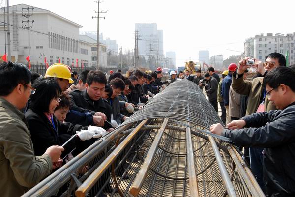 項目辦負責人向學員們簡單介紹了工程概況。學員們在工人師傅的指導下,紛紛戴上手套、拿起工具,給已成型的樁基鋼筋籠綁扎鋼絲,親身體驗了建設者的辛勞。學員們虛心向工人師傅學習,緊圍著鋼筋籠,一邊認真扎絲,一邊相互交流,探討綁扎技巧。在學員們的巧手下,兩個鋼筋籠很快完成綁扎,將用于晚間施工。