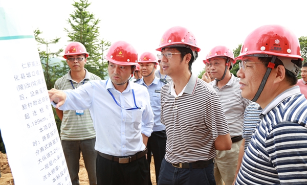 在仁新高速TJ1標(biāo)城口鎮(zhèn)五里亭隧道1號便道施工現(xiàn)場,劉鋒書記聽取了項目負(fù)責(zé)人關(guān)于工程進(jìn)展、存在困難及需要解決的地方問題的匯報,仔細(xì)詢問了鄉(xiāng)鎮(zhèn)城口路段征地拆遷、土地勘界進(jìn)展情況。