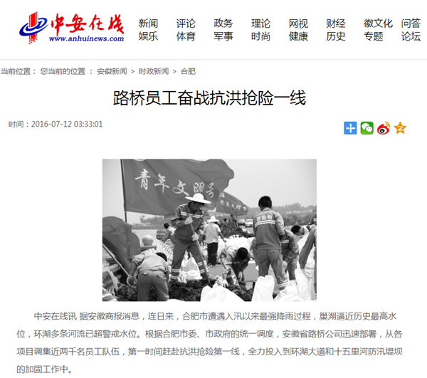 近日,公司積極響應(yīng)合肥市委、市政府號(hào)召,全力參與環(huán)湖大道和十五里河抗洪搶險(xiǎn)的事跡得到社會(huì)的高度關(guān)注。7月12日、13日,中安在線、《安徽商報(bào)》等多家省級(jí)媒體對(duì)公司抗洪搶險(xiǎn)事跡進(jìn)行了連續(xù)報(bào)道。