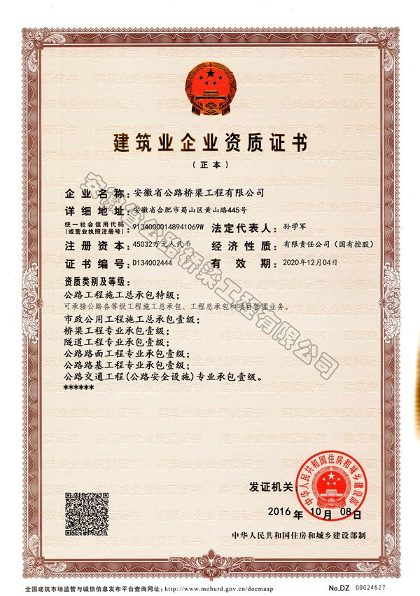 近日,住房和城鄉(xiāng)建設部發(fā)布公告,公司特級資質(zhì)順利獲批,成為安徽省內(nèi)首家也是唯一一家同時擁有公路工程施工總承包特級資質(zhì)和公路行業(yè)工程設計甲級資質(zhì)的企業(yè)。