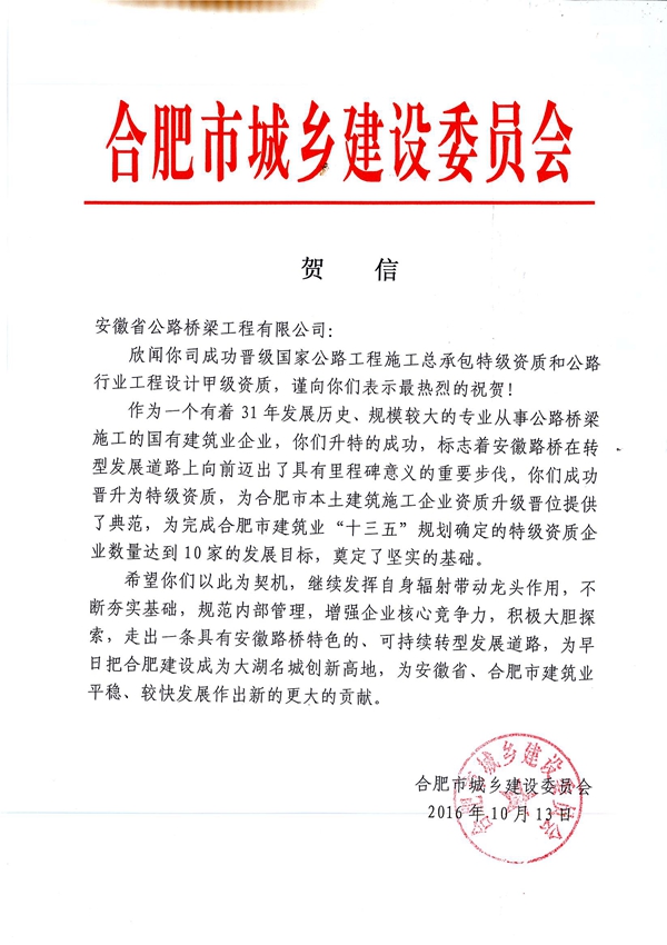 近日,合肥市城鄉(xiāng)建設(shè)委員會向公司發(fā)來賀信,熱烈祝賀公司晉升國家公路工程施工總承包特級資質(zhì)和公路行業(yè)工程設(shè)計(jì)甲級資質(zhì)。