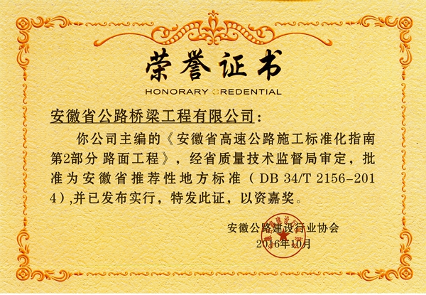 會(huì)上,省交通廳對(duì)在系列指南編寫工作中作出貢獻(xiàn)的單位和個(gè)人給予了表彰并頒發(fā)榮譽(yù)證書。公司主編的 《安徽省高速公路施工標(biāo)準(zhǔn)化指南 第2部分路面工程》(DB 34/T 2156-2014)獲得表彰,并經(jīng)省質(zhì)量技術(shù)監(jiān)督局審定批準(zhǔn)為安徽省推薦性地方標(biāo)準(zhǔn),發(fā)布實(shí)行。