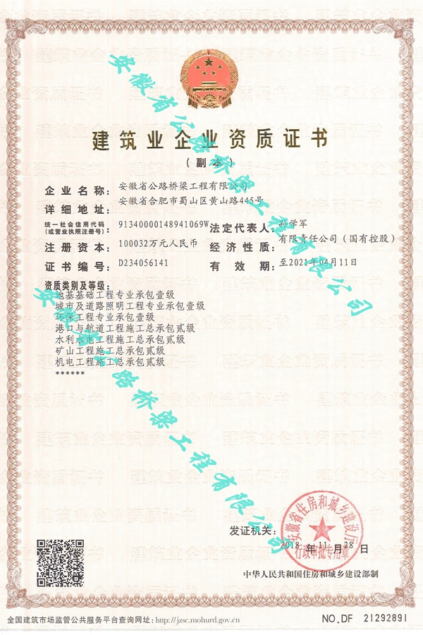11月28日,公司地基基礎(chǔ)工程專業(yè)承包壹級(jí)、城市道路照明工程專業(yè)承包壹級(jí)、礦山工程施工總承包貳級(jí)三項(xiàng)資質(zhì)順利通過安徽省住房和城鄉(xiāng)建設(shè)廳審查核準(zhǔn)。