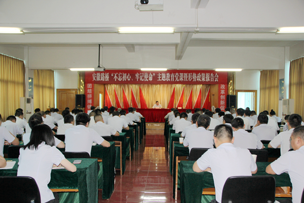 為進一步推深做實“不忘初心、牢記使命”主題教育,按照公司主題教育方案部署,8月2日下午,股份公司副總經(jīng)理、公司黨委書記、董事長孫學(xué)軍以“守初心 擔使命 找差距 抓落實——用習(xí)近平新時代中國特色社會主義思想指導(dǎo)打造品質(zhì)路橋卓越路橋”為主題,作了一場主題教育黨課暨形勢政策報告會。集團主題教育第四指導(dǎo)組副組長王永來到會指導(dǎo)。公司領(lǐng)導(dǎo),中層干部,在肥項目經(jīng)理、黨支部負責(zé)人,機關(guān)全體黨員100余人參加了報告會。