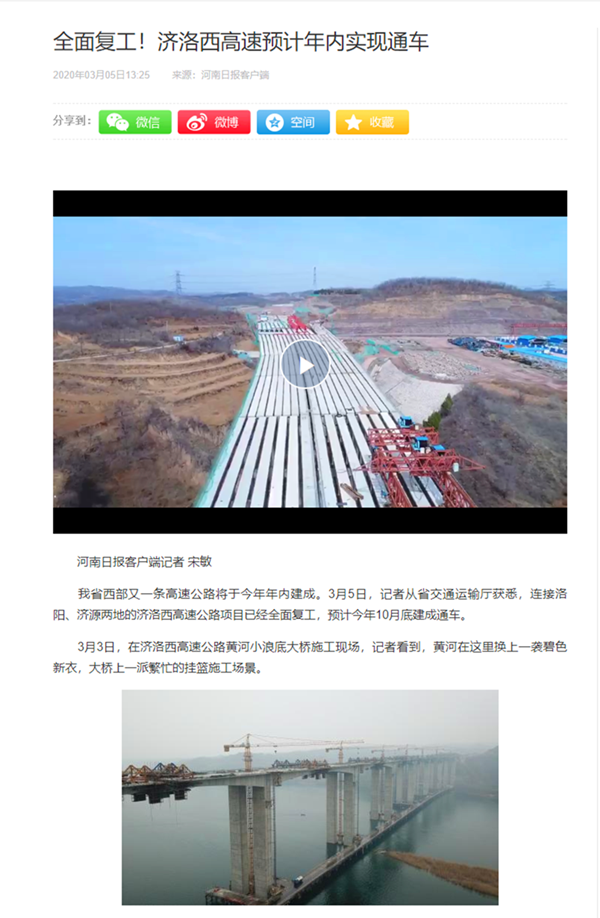 3月4日,公司承建的巢湖亞父路項(xiàng)目裕溪河大橋復(fù)工場景出現(xiàn)在人民網(wǎng)首頁,并刊文指出,為奪回疫情造成的停工損失,項(xiàng)目部嚴(yán)格落實(shí)防疫和生產(chǎn)要求,在保證安全質(zhì)量的前提下,加班加點(diǎn)趕施工進(jìn)度,確保大橋按期建成通車。河南衛(wèi)視、鳳凰網(wǎng)等多家媒體記者走進(jìn)公司承建的濟(jì)洛西高速黃河特大橋項(xiàng)目施工現(xiàn)場,實(shí)地采訪項(xiàng)目復(fù)工復(fù)產(chǎn)情況,并在中國網(wǎng)、河南日報(bào)客戶端、大河網(wǎng)進(jìn)行了登載。安徽網(wǎng)聚焦G318池州至殷匯段改建工程復(fù)工建設(shè),《今日宣州》以《按下交通建設(shè)“快進(jìn)鍵”》為題專題報(bào)道了公司宣城PPP項(xiàng)目在疫情防控形勢逐漸向好的態(tài)勢下,搶抓建設(shè)黃金期,優(yōu)化調(diào)整復(fù)工隊(duì)伍和施工組織計(jì)劃,把因疫情耽誤的工期搶回來,確保項(xiàng)目如期完工,開啟了復(fù)工建設(shè)趕進(jìn)度模式。