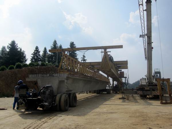 為確保架梁施工安全,我部精心制訂施工方案。同時,在架梁機(jī)械驗收合格后多次對其進(jìn)行檢查,對作業(yè)人員進(jìn)行班前教育,做好交底,制定應(yīng)急預(yù)案,保證了整個架梁過程安全、高效。隨著架橋機(jī)有節(jié)奏的完成一項項動作,襯墊、落勾、試吊、起吊、推進(jìn),在一串協(xié)調(diào)而又連貫的運(yùn)作之后,金字牌大橋第一片梁板穩(wěn)穩(wěn)降落在它發(fā)揮作用的位置上。第一片梁的成功架設(shè),拉開了我標(biāo)段橋梁上部結(jié)構(gòu)施工的序幕,為加快實現(xiàn)年度建設(shè)目標(biāo)邁出了堅實的一步。
