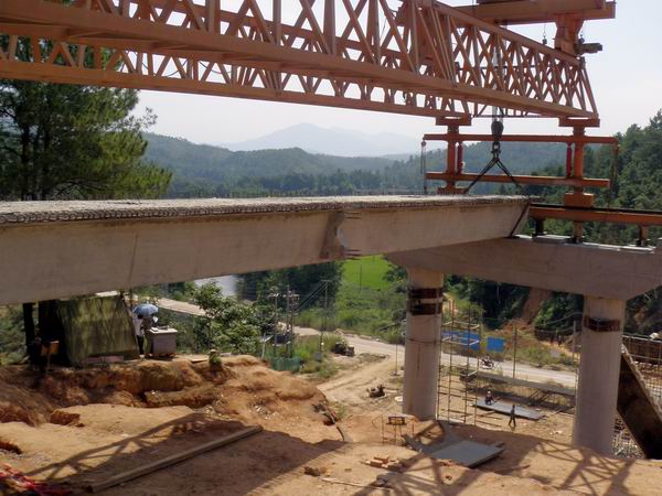 為了確保架梁工作的順利開展,項(xiàng)目部領(lǐng)導(dǎo)到現(xiàn)場指導(dǎo)架橋機(jī)的拼裝、檢驗(yàn)等工作,通過對(duì)架梁人員進(jìn)行分部分項(xiàng)技術(shù)交底,讓所有現(xiàn)場作業(yè)人員都能做到熟捻于心。經(jīng)過施工人員精心施工,努力奮斗,于10月2日完成架橋機(jī)拼裝,10月3日完成調(diào)試。10月5日,在項(xiàng)目部領(lǐng)導(dǎo)、監(jiān)理和駐地辦領(lǐng)導(dǎo)的共同指揮下,我標(biāo)段首片箱梁成功架設(shè)?,F(xiàn)場鞭炮齊鳴,掌聲如雷,為國慶增添新的喜慶。