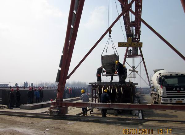 為確保此次箱梁澆筑過程萬無一失,項目部精心制定澆筑施工方案,提前做好各項準備工作。項目部對澆筑設備及混凝土進行反復檢驗,制定應急預案,要求全體人員在澆筑過程中樹立高度的責任心,保證整個澆筑過程安全、有序。隨著砼灌車進入梁場,試吊、起吊、前移、就位、澆筑,一串協(xié)調(diào)而又連貫的運作之后,第一片箱梁成功澆筑。